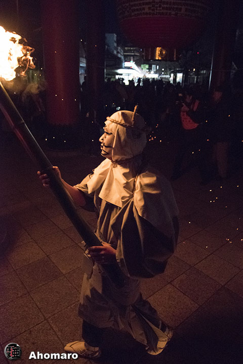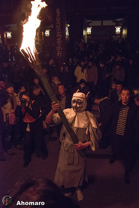 午後6時5分、境内全ての電気が消灯され、陀羅尼門から二体の鬼が松明を持って登場しました。