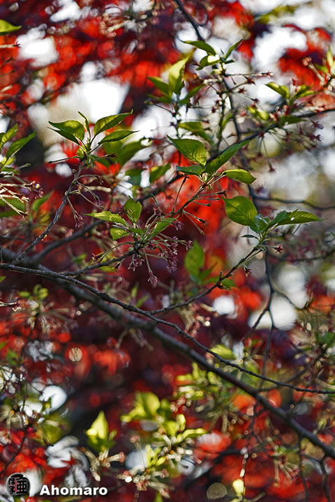 ソメイヨシノの後ろに赤い葉を開くのはノムラモミジ、たとえ桜は終わっても、春色のコラボレーションはまだまだ楽しめますよ。