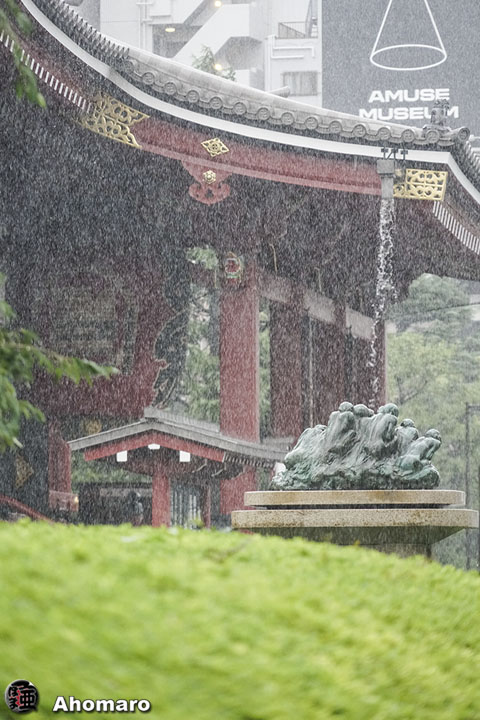 昭和39年に江戸消防記念会が寄贈した金属製の天水桶。当初は、雨水溜めだったとか。それが今では、香炉の線香に火を点けるための七輪入れとして使われています。これまさに「火水一体」。
