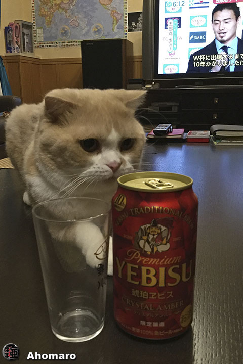 ヤマト君の晩酌。今夜は、忍者ポーズの五郎丸が帰国したから祝っちゃる。