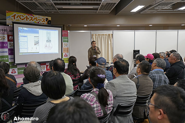 収集家の講演会も行われていました。「スタンプマガジン」で連載中の、「風来坊、浮世絵の街を往く!」著者の古沢氏、切手の図案と風景印のマッチングについて熱く語っておりました。