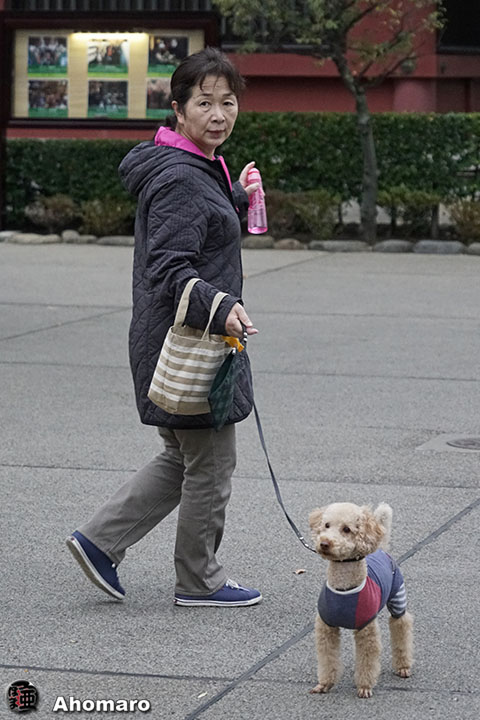 まだ薄暗い境内をメイちゃん。