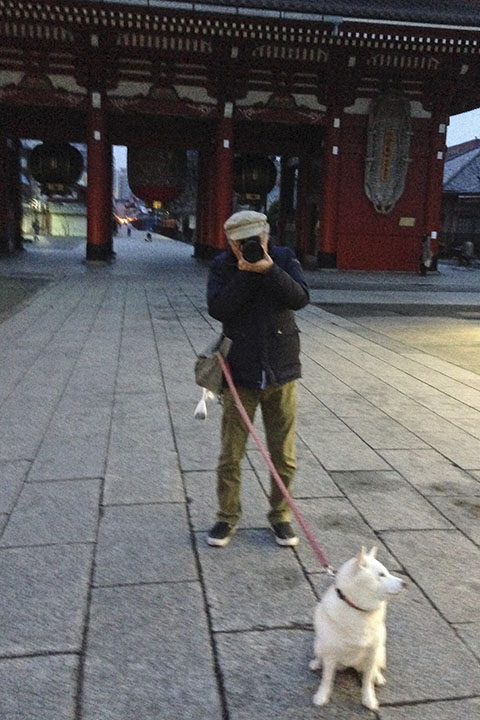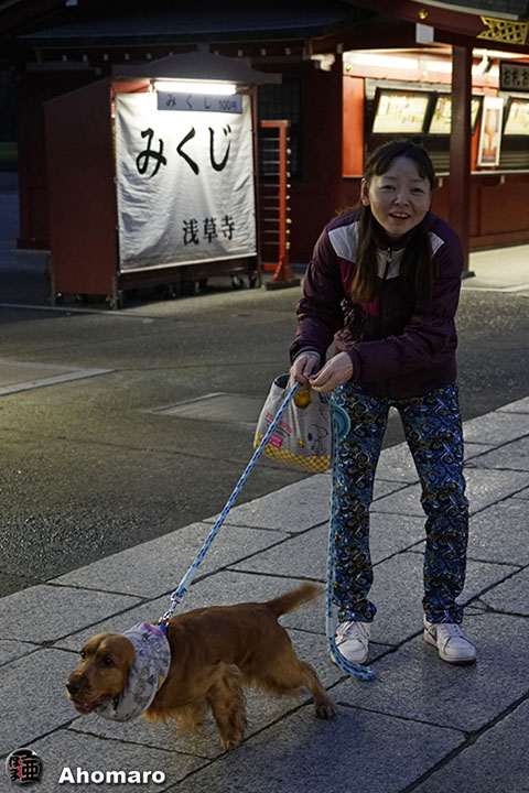 真っ暗な境内にモコちゃん。おかあさんの顔がぶれちゃった。