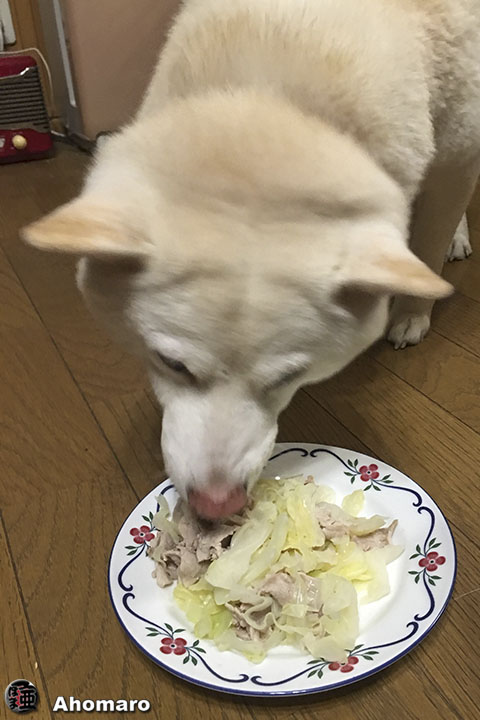 お誕生日のお祝いはチンヤで買った鹿児島黒豚と野菜の煮付け。ナナちゃんにとっては、年に一度のごちそうですね。側でタマちゃんも食べたそうにしていると、ナナちゃんはお皿から離れてタマちゃんにも食べさせてあげました。とっても優しいナナちゃんなのです。