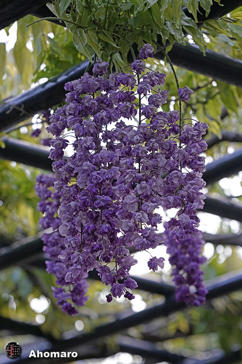 境内の藤棚。風が強くて左右に大きく揺れていました。