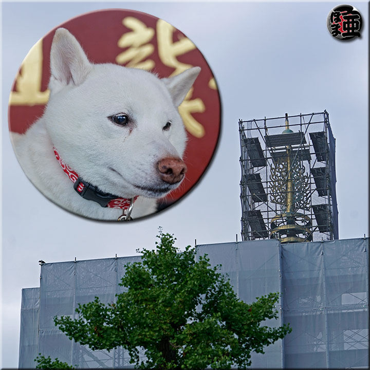 五重塔の改修工事の足場が相輪のてっぺんまで組まれました。これで、東日本大震災で被害を被った宝珠、よやく元通りに修復されるのですね。