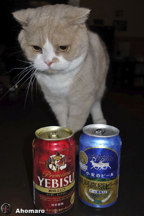 ヤマト君の晩酌。どちらかひとつ選べだって、バーロ〜全部呑んじゃる、ニャロメ。