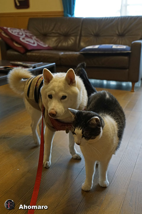 あ、帰って来た。 ナナちゃんお帰りなさい。 ヒロちゃん待ってたよ。 ナナちゃん今日から胴輪に変えたんだね。 ヤマト君待って無い。 タマちゃんは待ってたよ。 でも、胴輪ってとっても窮屈なんだよな・・・。 おまけに何度も外れてしまったんだよ。 そんなの着けなけりゃ良いのだ、ニャロメ。 イヤだけど、これがナナちゃんの命綱なの。