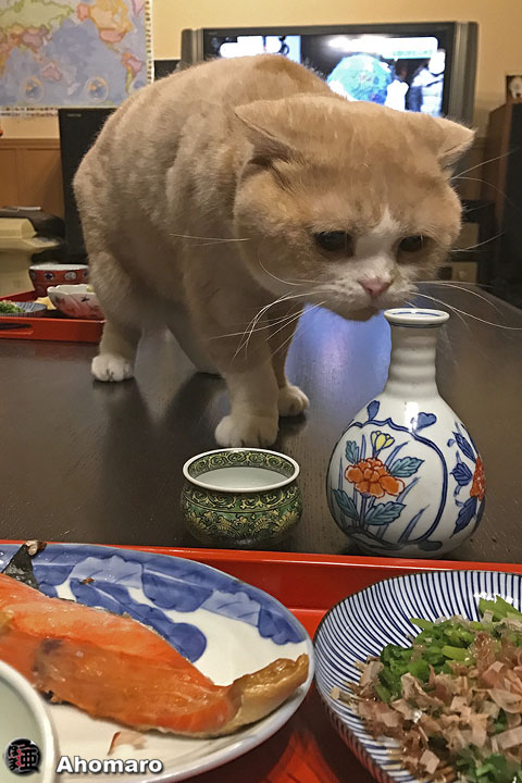 ヤマト君の晩酌。「プレミアムフライデー」でビール飲んだから、今夜は猫舌がニャロメの熱燗なのだ、ざまーみろ!