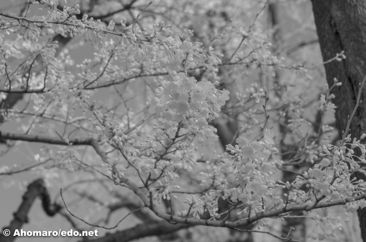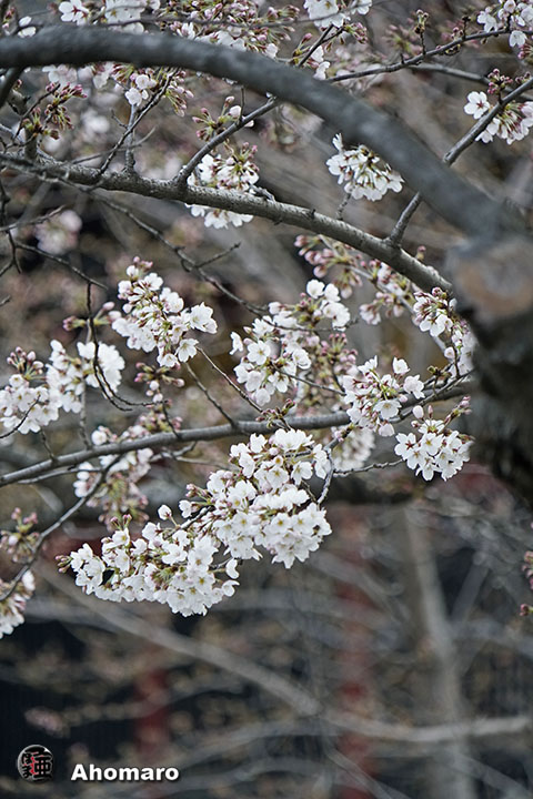 浅草神社のソメイヨシノ。開花から8日目ですが、開花はまだこの程度です。