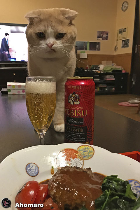 ヤマト君の晩酌。知り合いから誕生祝いでもらった久谷焼の皿を使ってしまったな、ニャロメ。