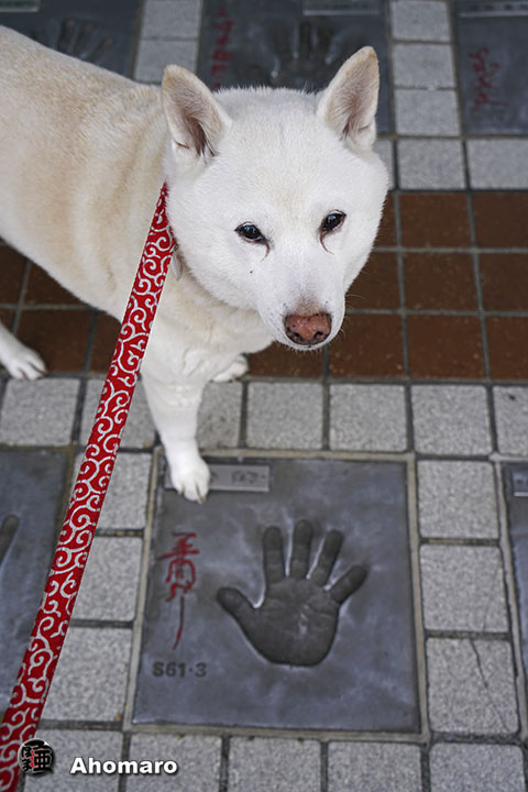 散歩の帰り、浅草公会堂前のスターの広場で圓歌師匠の手形と握手。