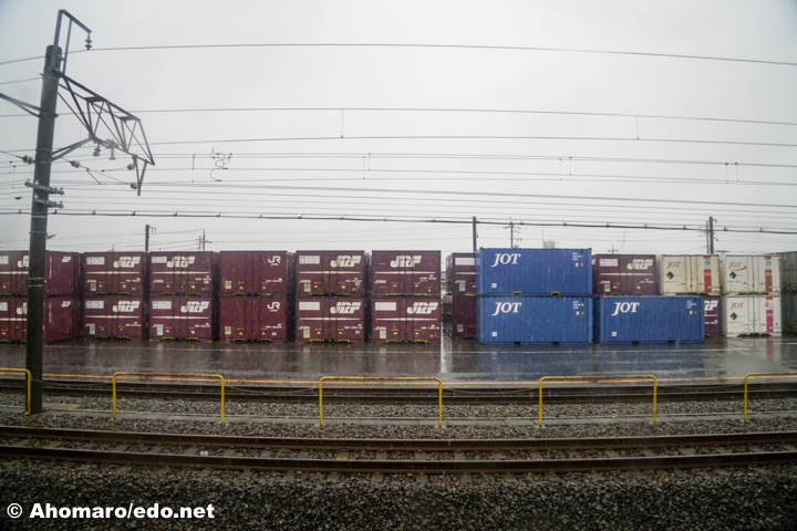 稲沢線で最初の停車は稲沢愛知貨物基地。雨がどんどん激しくなってきたけど、乗られるだけで車窓が見えなくても結構なのです。