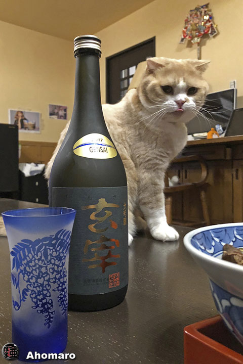 ヤマト君の晩酌。おいおい、福島で買って来た酒がまだ残ってる、ニャロメ。