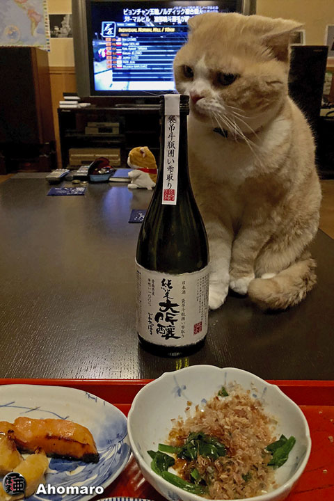 ヤマト君の晩酌。青森の親戚から頂いた大吟醸を見付けてしまったのだ。