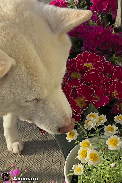 ナナちゃんはお花が大好きなので、いつも臭いを嗅いでいるんだよ。