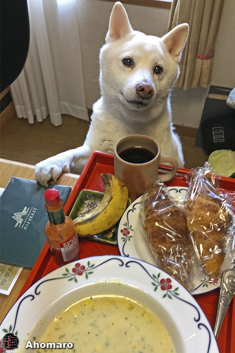 ナナちゃんと朝ご飯。今朝はクロワッサンでるんるんだったね。