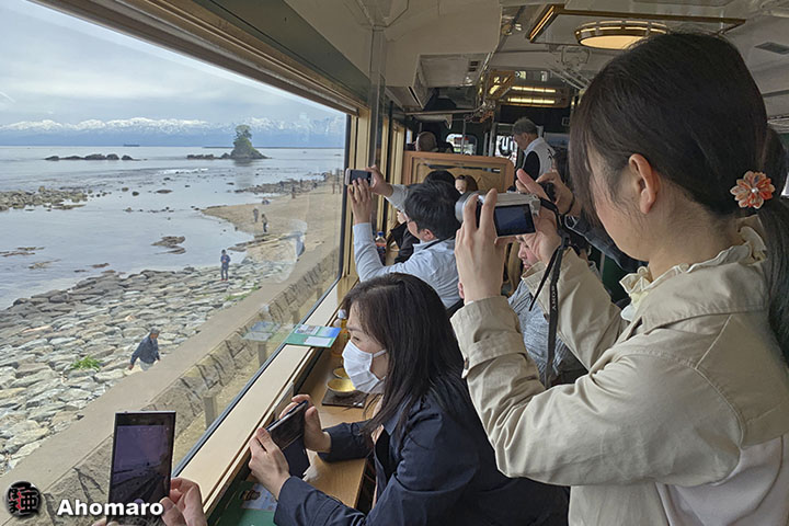 氷見線唯一の観光スポット雨晴海岸にて一時停車、車窓に群がる人々。