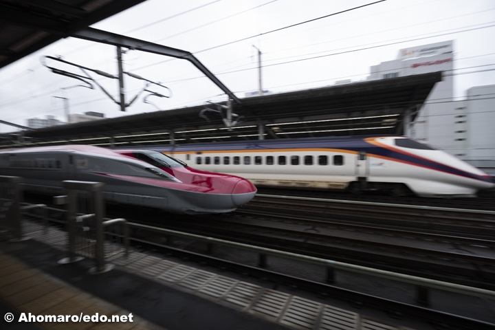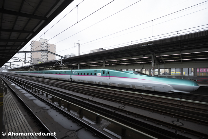 「E5系」はピンク色のラインなのに対し、「H5系」は北海道のライラックやルピナス、ラベンダーなどをイメージした薄紫色ですが、一日2往復しか運用が無いので通過姿を見るために、事前にダイヤを確認しておいたのでした。