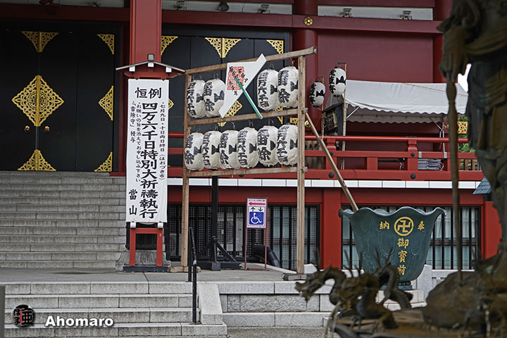 浅草寺j本堂前の「四万六千日・ほおずき市」の提灯。この日は、特別なお札「雷避」が500円で売られます。大切なパソコンのお守りに如何でしょうか。信じる者は救われる。