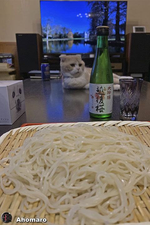 ヤマト君の晩酌。午後なのに御膳蕎麦か、ニャロメ。