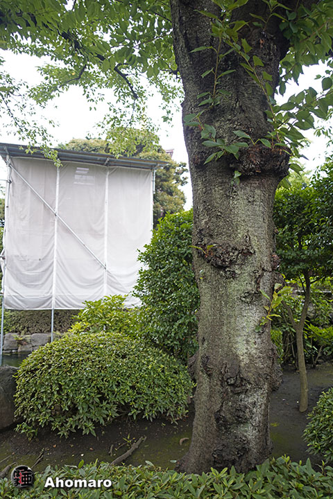正岡子規句碑「観音で 雨に逢ひけり 花盛」