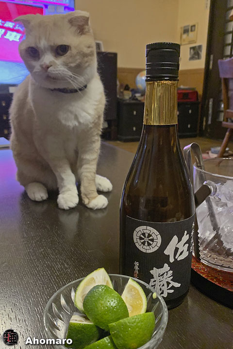 ヤマト君の晩酌。佐藤の黒にカボスで悪いか、ニャロメ。