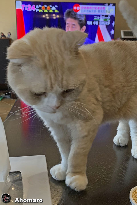 ヤマト君の晩酌。先週、下田で買った最後の酒を呑んでしまうのだ、ニャロメ。