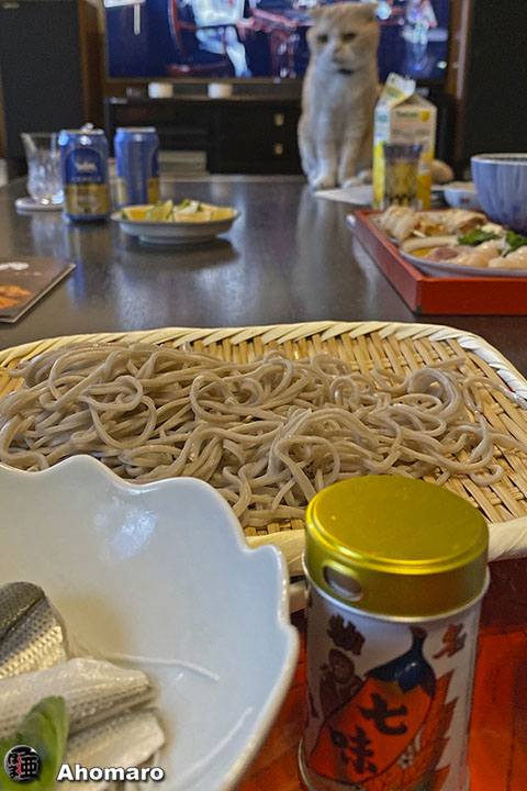 夕食はヤマト君と晩酌。夜も久しぶりのお蕎麦にあほまろ感激、ヤマト君あきらめて、ニャロメ。