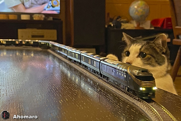 走行音と電気が点く特別仕様の瑞風、かっこ良いでしょ。