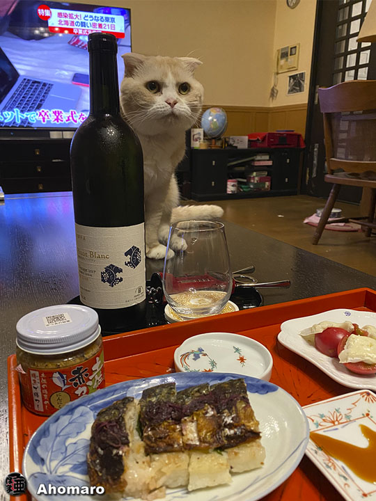 ヤマト君の晩酌。不要不朽の外出するなってので、不要で普及してねぇ不味いワインしか残ってねぇのか、ニャロメ(≧∀≦)