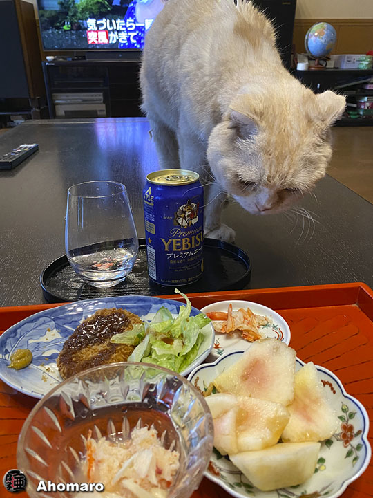 ヤマト君の晩酌。たまには早い時間から呑んでやるか、ニャロメ。