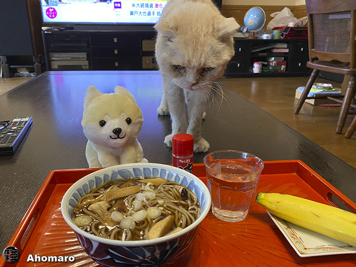ヤマト君の朝飯前。おお、今朝は久しぶりのお蕎麦がマツタケ蕎麦なのに、トマヤ君は何所に行った、ニャロメ。