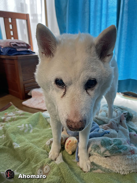 おみやげの秋田犬に興味を示さなかったのに、今朝はちゃんと側に置いてますね。