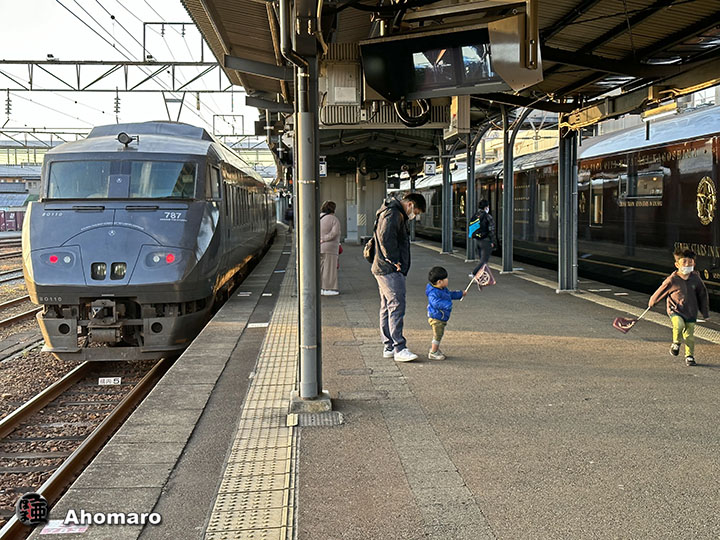 おはようございます。あほまろは新たな人生の始まりを、博多で迎えました。 今回の旅は、クルーズトレィン「ななつ星」にて、息子と九周を一周してきました。 昨日の日記は車内からアップしようと試みたのですが、ネット環境が悪くて書き換えが出来なかったのですよ。 4度目となる「ななつ星」の旅は、一泊二日で九周を一周する新しいコースです。 過去の旅は三泊四日の旅なので、今回はちょっと短いかなと思っておりましたが、バス移動もホテル泊まりも無く、ただひたすら九周を巡っていたことで、実時間よりも長く感じるほどでした。 車掌の古川氏、食堂車で息子にウヰスキーの飲み比べを勧めてましたが、酔い潰さないでくださいね。 お部屋は寝台車なので、夕食中にソファーからベットに変更されております。 九周一周コースは、博多から鹿児島本線で八代、おれんじ鉄道では、東シナ海に沈む夕日を眺めての夕食。川内から鹿児島本線に戻り鹿児島駅にて就寝。延岡で朝を迎え、佐伯、大分と進むのです。 大分駅で機関車を入れ替え、進行方向を変えて久大本線に入るのです。写真は延岡駅に停車中。 入れ替え用の小さなディーゼルですね。 駅に着くと、沿線の子どもたちが旗を持って我々を歓迎してくれるのです。 日豊本線の秘境駅「宗太郎駅」にも停車しましたよ。以前は友人と、車で来たことがありましたが、列車で降りるのは初の経験でした。 佐伯駅では約1時間の停車中に「ななつ星バス」にて造船所観光でした。 佐伯のみなさんありがとう。 車内に新たに設けられた茶室にて、スルーの泊さんからお茶を頂きました。泊さん以前はロイヤルエクスプレスに乗務していらっしゃった方で、あほまろのことを覚えていらっしゃいました。 食堂車では、ピアノとバイオリンの生演奏が行われますよ。 演奏を聴く愛犬ナナちゃん。 ティアラを付けてましたよ。 旅の終了後は、博多駅のラウンジにてみなさんとお別れでした。 博多駅では、クリスマスイルミネーションが飾られライブが行われていたのでw、大勢の方で賑わっておりました。 今日もこれから列車旅なので、今日の日記はiPhoneで撮った写真だけですが、戻って写真の整理を終えたら詳細を記すことにいたしますね。 それでは、博多駅より再び旅立ちです。 Memo iPhone 14 ProMAX