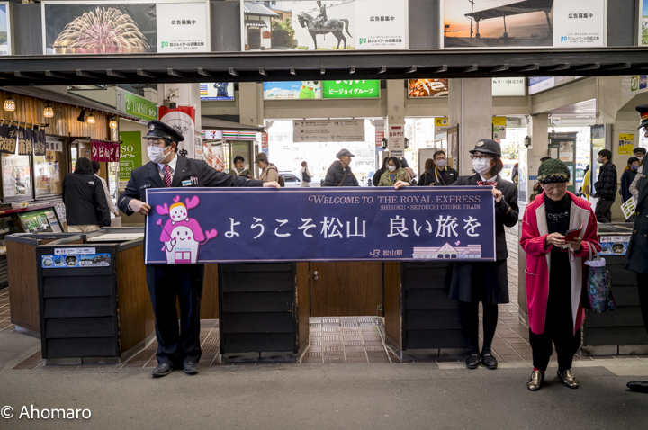 ロイヤルエクスプレスの旅の2日目は、多度津駅から松山駅までなので、今朝は松山道後温泉の宿で朝を迎えました。 いつものように早朝散歩しようと外に出ましたが、東京よりも日の出が遅いため、外はまだ真っ暗でしたよ。それでもホテル近くの坂道を歩いてみましたが、写真も撮れずにただ疲れてしまいましたが、それでもここは道後温泉。優雅な朝風呂に浸かって疲れを癒やし、今日の日記をまとめているのであります。 昨日は、琴平からバスで多度津駅に向かいました。多度津駅では、多くの鉄道ファンが珍しい列車を記録しようと集まり、四国ツアーの初便ということで、YouTubeにもたくさんの動画が掲載されていましたよ。 多度津駅の表示版に臨時列車の案内が掲載されておりました。 今日も真新しい桃太郎の牽引です。四国内は、JR貨物では無く、機関車に不慣れなJR四国の運転手と車掌が担当することで、運転訓練を何度も繰り返していたそうでした。 ホームで知り合った撮り鉄の方が、他にもこの運行による様々な問題点を語ってくれましたよ。 彼はこれまで試験走行のロイヤルエクスプレスを撮影していたようですが、やはり初便のホームとその周辺に集まる送迎客の雰囲気は欠かせないとおっしゃっていましたね。 特に、この時間帯は観光列車「四国千年物語」とのすれ違いがあるため、それは撮り鉄として外せない瞬間なのだとか。 ロイヤルエクスプレスの乗車口は一カ所のみで、その乗車口には絨毯が敷かれるのです。 クルーの内田さんが笑顔でお出迎えしてくれました。 大勢のJR職員に見送られて構内を出発し、かつての給水塔前にも見送りの方々がいらっしゃいましたよ。以前は鉄道の要所だったので、何度も訪れたことがあった懐かしの駅なのです。 2日目より進行方向が変わり、機関車は電源車の前に着いたことで、8号車が先頭となりました。 さんざん北海道で慣れ親しんだ光景が、四国でも見られるなんて、ちょっと不思議な感覚でしたよ。 寛永通宝の砂型を撮影しに来たことのある観音寺駅。ここには3度ほど訪れたことがある懐かしい駅ですよ。 今回はフイルムカメラも同行です。 ななつ星でも有名なステンドガラスですね。 先頭の8号車は乗客がいなかったので、のんびり過ごすことができましたね。 最後尾には、3名の車掌さんが乗務していて、その会話も聞こえました。女性車掌さんが「一度は乗客として乗ってみたいけど、無理でしょうね」とか話していましたよ。 運行の邪魔をしないようにと、通過電車を待つため何度も運転停車が行われました。 しかし、乗客は降車できませんでしたよ。 昼食は、地元で有名なレストランが担当し、美味しいお料理を提供してくれました。 「いぶし瓦」の製造でお馴染みの菊フ駅です。ここもかつて、国鉄仁堀連絡船(にほりれんらくせん)に乗るため堀江駅に向かう途中で、時間調整で立ち寄った懐かしの駅です。 車窓から、あちらこちらに撮り鉄さんを見かけましたよ。 終点松山駅に到着し、2日目のクルーズ終了です。 松山のゆるキャラがお出迎え。 松山駅にも大勢集まった撮り鉄さん。 JR職員が歓迎幕にて迎えてくれました。 前回、松山駅を訪れたのは、観光列車「伊予灘ものがたり」に乗車する時でした。 松山駅は高架工事中なので、この駅舎が見られるのは最後かもね。 松山駅からバスにて道後温泉の宿でした。 久しぶりに訪れた道後温泉本館は、工事中でしたよ。 宿チェックイン後、娘と道後温泉を散策しました。 伊予鉄の名物だった坊ちゃん列車は運行を止めてしまったので、道後温泉駅にて展示されておりました。 列車はレプリカですが、初期気のプレートも複製されたのでしょうね。 駅から商店街を散策し、犬友へのおみやげ探しですよ。 ミッキーのような雪だるま? おみやげ屋さんは、さすが温泉地。 かつての街道標識も複製でしょうね。 道後温泉のお宿です。 ひとりにはもったいない空間でしたよ。 そして夕食の晩ご飯には、有名温泉地なので禁酒中でも地酒は欠かせないことになっているらしいので、飾りとして側に置いていただきました。 お料理は、こんなのとか、 あんなのとか、 こんなものまで。娘と美味しく頂きましたよ。 松山のマンコレ。 Memo iPhone 15 ProMAX Leica M11 APO-SUMMICRON-M f2.0/35mm ASPH. APO-SUMMICRON-M f2.0/50mm ASPH. TRI-ELMAR-M f4/16-18-21mm ASPH.
