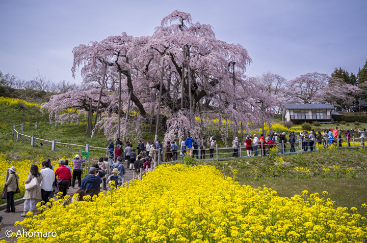インターネットで三春の滝桜が満開になったという情報を目にし、その場にいてはもういられなくなり、昨日は急遽、弟子の古麻呂を連れて三春へと出かけました。平日なので新幹線は空いていると見込み上野駅の券売機で席を予約しようとしましたが、普通席はほぼ満席なので、仕方なく比較的空いていたグリーン車に奮発して郡山駅まで行ったのです。しかし、二時間に一本の磐越東線にはギリギリ間に合わず、結局タクシーで移動することにしましたよ。でも、滝桜まで3キロメートル付近からは大渋滞に巻き込まれノロノロ運転。結局タクシーから降りて歩くことにしたのでした。やはり、滝桜の満開の情報は多くの人々の耳に入っていたようですね。当たり前か。 |