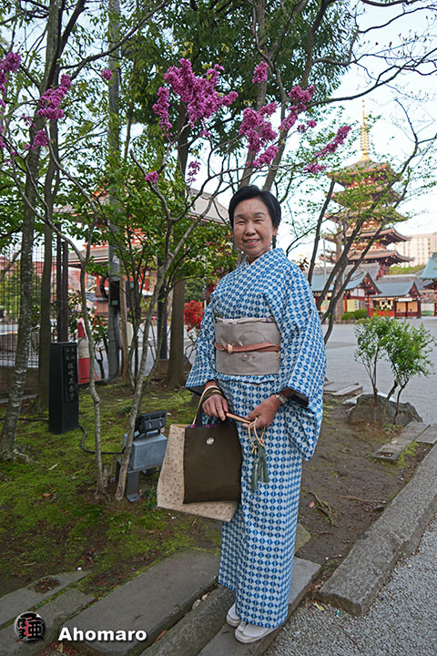 4月の第二日曜日は「白鷺の舞」の奉演なので、八千代さんは和服姿でいらっしゃったので、満開になったハナモモの下で撮ってあげました。
