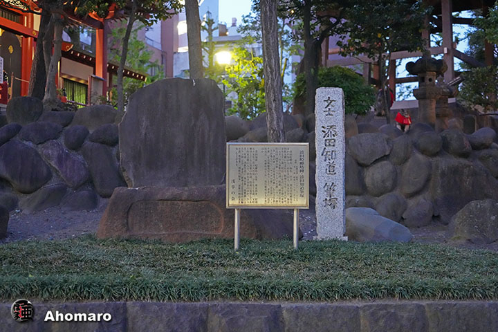 添田唖蝉坊と息子の添田知道の筆塚。人面石「唖蝉坊君」は後ろに移動されてしまいました。