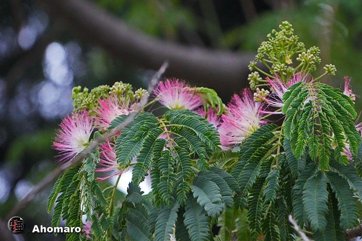 観音裏の合歓の木(ネムノキ)が化粧用の刷毛のような独特の紅い花を咲かせてくれました。その幻想的な雰囲気をぼんやりと楽しんできましたよ。合歓の花は夕方に開き、翌朝にはしぼむのです。夜になるとゆっくり閉じるその様子がまるで眠るように見えるため、「眠りの木」と呼ばれ、それが「合歓の木」という名前の由来となったそうです。地方によっては、ねんねの木、眠りの木、日暮らしの木など、さまざまな呼び名があるようですね。 |