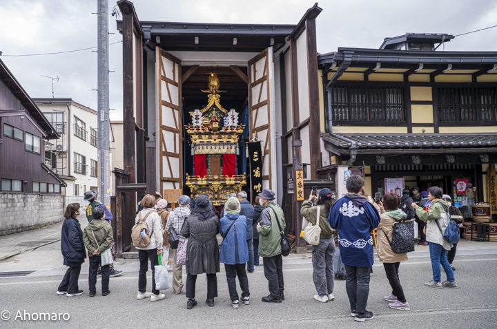あほまろは、飛騨高山の旅も二日目の朝を迎えました。今回の目的は、四百年の伝統を誇る「春の高山祭」に触れるためだったのです。 高山の街は、この時季としては比較的気温が高く、春の息吹を肌で感じさせてくれるものでしたが、空模様だけは少々気まぐれでしたよ。晴れたかと思えば、すぐにぱらぱらと雨粒が落ちてくる・・・、そんな不安定な天候が続いていたのです。祭りが本格的に始まった14日も、あいにくの空模様で、最大の見どころのひとつである豪華絢爛な屋台の「曳き揃え」は中止となってしまいました。お祭りのためにわざわざやって来たあほまろとしては、これほど残念なことはありませんでしたよ。 それでもせっかくの高山滞在、雨にめげることなく、早朝の「宮川朝市」へと足を運んでみました。以前訪れた時とは打って変わって、屋台の数もまばらで、かつての賑わいは影をひそめておりましたが、それでも西洋からの団体観光客が大勢押し寄せていて、異国情緒すら感じるような朝の風景でございました。 朝市を後にし、古い街並みをそぞろ歩いておりますと、午前10時から「からくり奉納」が始まるとの知らせを耳にしたので、時間まで、各町の屋台蔵に待機する屋台を見て回りました。 これが「龍神台」なので、後ほどカラクリを見るのです。 産婦人科医院も酒屋の佇まいでしたよ。 保存地区の上三之町です。 高山には酒屋が多いですよ。明後日から禁酒を予定しているあほまろですが、蓬莱純米吟醸の試飲をしてしまいましたよ。 朴葉味噌の昼食を予定している「久田屋」です。 高山の学校は、お祭りが休みなので、子どもたちも袢纏姿で繰り出してましたよ。 地元のテレビ局は、雨でも中継の準備をしておりました。 高山のおみやげは、「サルボボ」。飛騨地方の方言で赤ん坊を表す「ぼぼさ」が訛ったものですよ。でもきっと、九州の方々はお求めにならないでしょうね。 飛騨独特の漬物「めしどろぼ漬」。美味しいですよ。 おみやげ屋では、サルボボのお出迎え。 雨天のため、屋台蔵の中での奉納とはなりましたが、幸運にも、高山祭で最も華やかと評される「龍神台」の演舞だけが見られましたよ。 屋台は国の重要文化財なので大切にされ、雨の日は蔵から出られないのです。 舞い踊る龍の動きはまるで生きているかのようで、機巧(からくり)の極みを尽くした匠の技に、思わず息を呑んでしまいましたよ。 ただし、その会場となった上三之町の屋台蔵前は、非常に狭い通路で、身動きも取れぬほどの人で埋め尽くされておりました。あほまろたちは無理をせず、通りの真向かいにあったお土産屋に立ち寄り、買い物を楽しみながら、その店のガラス越しにからくり奉納を鑑賞させていただきました。最近では、YouTubeなどでも祭りの様子が気軽に見られますが、やはり、実際の目で本物を見たときの感動とは比べものになりませんね。「百聞は一見にしかず」とは、まさにこのことだと改めて実感したのでした。 祭りは夕方まで続く予定でしたが、結局、天候は回復せず、屋台が再び町に曳き出されることはありませんでした。けれども、雨の中で見た静かな朝市、古き良き町のたたずまい、そして、蔵の中で舞う龍神の姿それぞれが、旅の記憶として深く心に刻まれたのでした。 次に訪れるときは、どうか晴天のもと、あの豪華な屋台が町中を練り歩く様子を、この目でしっかりと見届けたいものですね。 からくり奉納の余韻を胸に、あほまろは街の一角にある、飛騨で名の知れた老舗店で頂いたのは、飛騨名物「飛騨牛の朴葉(ほおば)味噌焼き」。熱した朴の葉の上で香ばしく焼かれる味噌の香りに包まれながら、舌の上でとろける飛騨牛の旨味に、思わずため息がこぼれました。しとしとと降り続く雨音をBGMに、弟子たちとしばし旅の贅沢なひとときを味わったのでした。 市内の中心部を流れる宮川にかかる「中橋」。赤い橋と周囲の自然が溶け込んだ様は飛騨高山の代表的な風景の1つに数えられているのです。 せっかく高山まで足を延ばしてきたのに、「曳き揃え」の中止で祭り屋台の全容が見られなかったことが心残りで、午後は趣を変えて、秋の高山祭で使用される屋台の実物が展示されている「高山祭屋台会館」へと向かったのでした。 高山のソメイヨシノは、まだ3分咲きでした。 高山では、赤丸ポストを良く見かけます。きっと町の雰囲気を大切にされているのでしょうね。 高山祭屋台会館では、秋の高山祭(10月9日・10日)に曳出される11台の実物の屋台(国指定重要有形文化財)を年3回入れ替え展示しています。 あほまろがこの会館を訪れるのは、今回が二度目になります。けれど、今回は弟子たちを連れての訪問であったため、あの豪奢な屋台の全体像をぜひとも見せてやりたかったのでした。 このお神輿は重さ2トン半、日本一の大神輿と言われていますが、現在は運行されていないようでした。 館内に並ぶ祭り屋台の数々は、どれもが匠の技の粋を極