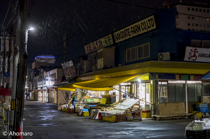 旅のハイライトは2日目でしたが、早寝早起きのあほまろはいつも通りの時間に目が覚めたため、朝の函館を散歩することにしました。向かったのは、函館の名物スポット「函館朝市」。函館の朝は早く、午前4時にはすでに市場の方々が準備に取りかかっている様子が見られました。
