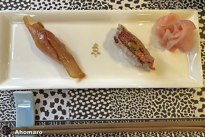 二皿目は「本マグロ赤身」「ひらめ」「ほうぼう」「まとうだい」「黒むつ」「玉子焼き」。