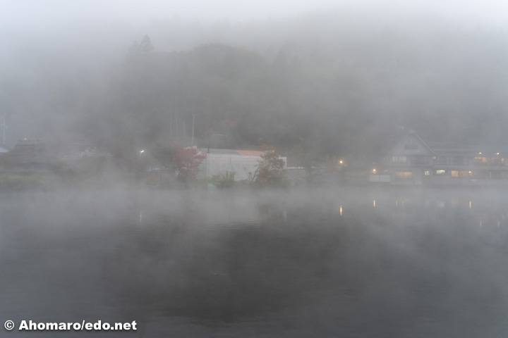 目覚めて朝風呂に浸かっている間に日の出です。陽が昇り明るくなると、一面覆い尽くす朝霧が発生しました。 この時期の朝霧は、由布院盆地を一望できる展望台「狭霧台(さぎりだい)」から見ると、由布院盆地が雲海になっているとのこと、しかし狭霧台までは歩いて行かれ無いので、諦めて金隣湖周辺を歩いてみました。 朝霧の濃い場所を通ると、足元が隠れてしまうほどでしたが、まるで雲上の人になったかのようで気持ちの良い経験をさせていただきました。 湯布院の朝霧が見える条件は、「前日の昼間は晴れて暖かく、夜間に急激に気温が下がり、当日の朝は晴天で無風」ということです。この条件を満たす朝には、湯布院の街が濃い霧に覆われる幻想的な光景を目の当たりにできたので、早起きは三文の以上の徳でしたよ。 昨日はみんなに餌をねだっていたガチョウ、今朝は近寄ったら逃げやがった。 由布院は1000メートル級の山々に囲まれて、由布岳の麓に広がる標高450メートルの盆地ですが、いつも気温が低く他と比べて特殊な植物も生息していると聞いたことがあるので、この奇妙な高山植物のような花も特別なのかも。 気になって何の花かネットを調べても解らず、とりあえずここでは仮称、「ふにゃふにゃ白花」とでもしておきましょう。 誰も採らず、夜露に濡れて熟しているのでたぶん渋柿でしょう。 30分ほど歩いていると徐々に朝霧が薄くなってきました。 金隣湖の対岸の神社は夜通し電球が点っているようです。 視界が悪いのに白鷺が飛び交っていましたが、白鷺には見えているのでしょうね。 大群から離れた一羽が鳥居の上に停まったようです。 そっと近づくと、 気付かれて逃げられました。悪いことしようとは思って無いのにな・・・。 鳥居から離れたら、また戻って来やがった。 由布院はすっかり秋、どんどん紅葉が広がっているのでした。 宿に戻ると縁側の紅葉が綺麗なので、扉を開けて縁側に出て写真を撮り、部屋に戻ろうとすると、何故か鍵が掛かってしまったのです。 女房を呼ぼうと扉をドンドン叩いても、女房は2階の部屋に居るようで気付いてくれません。庭の周りは高い塀に囲まれ出ることができません。朝霧で冷えているので、いつまでもここに居ると身体が冷え切って風邪でも引いたら大変、なんとかしなくちゃいけないと、縁側に突き出た庇に手をかけ、2階の部屋に向かって大声で助けを求めて、ようやく女房が気付いて降りて来て一件落着。 縁側の扉は外からは開けられないように自動扉になっていたのです。それ、もっと早くに言って欲しかったですよ。きっと、他にも同じようなトラブルに遭遇した客だって居ることでしょうから。 「ななつ星」の列車は、整備のために大分に戻っているので、由布院から別府までは専用のバス移動なので、バスまではタクシー移動。 昨日、散歩中にバスを見かけたホテルまで移動するのかと思ったら、バスはすぐ近くの由布岳を望む駐車場で待機しておりました。 由布院から別府まで約一時間のバスの旅。クルーの方が湯煙が上がる山の中腹も塚原温泉というアトピーに悩んでいる人に効果があるという有名な温泉のようです。 別府の街、今回の旅でもしょっちゅう歩いている町。そしていつも気になっているエッチビルのエッチ美容室が見えてきました。それにしても、何故「エッチ」なのでしょう。「エィッチ」にした方が誤解されにくいんじゃ無いのでしょうかね。 ようこそ別府へ、地元の方々が横断幕でお出迎えしてくれました。 「山は富士 海は瀬戸内 湯は別府」これ、100年前に、日本で初めて女性ガイドを載せた観光バスを走らせるなど「観光別府」の基を築いた「油屋熊八」が考えたキャッチフレーズなんだって。 別府のホームに「ななつ星」が待っておりました。 今日は一日中、我がお部屋は残念ながら機関車に占領されているのであります。 そんなワケで、あほまろは1号車の窓にビデオを備えることにしたのでした。 由布院からDE10にて牽引されて来たのです。 「ななつ星」塗装のDE10は、3両存在し総て熊本機関区所属になっているのですが、大分駅と福岡駅に常駐しているとか。 ほら、所属が「熊」となっているでしょ。 DE10は、大分駅まで最後尾の一号車に接続され、大分駅にて切り離されるのです。 こちら7号車が先頭となるのです。 白い「ソニック」とすれ違い。 別府駅を11:00出発。 あほまろは1号車に陣取り、写真とビデオでDE10を撮りました。 別大マラソンでお馴染み、大分マリーンパレス水族館「うみたまご」を通過。 「ななつ星」色のDE10も格好良いでしょ。 DE10を見ながら、柿右衛門の器で贅沢なコーヒーを頂きましたよ。 ありがとう、おいしいですよ。 11:14、大分駅でDE10を切り離し、今日は延々日豊本線を走って鹿児島中央駅に向かうのです。 11:58臼杵到着。臼杵駅のホーム駅名表「う♥」、リンクで、ななつ星クルーがおしゃれでしょって言ってますよ。 昼食は臼杵で乗り込んで来た