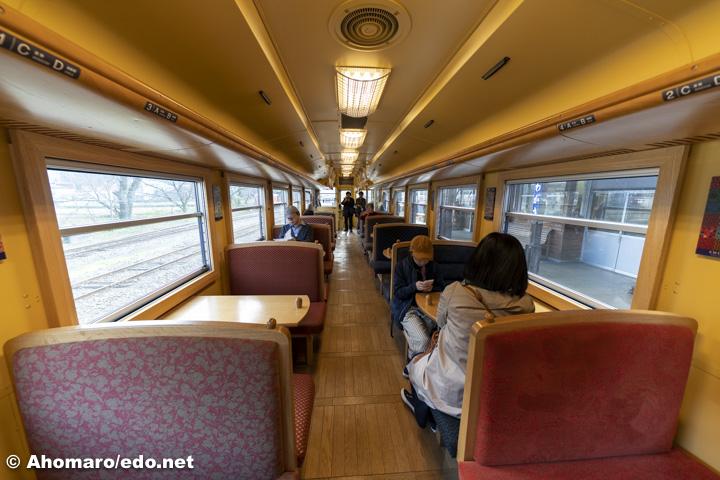 車内は木材を多用してソファやテーブルを置いた、ご存じ水戸岡風ですね。