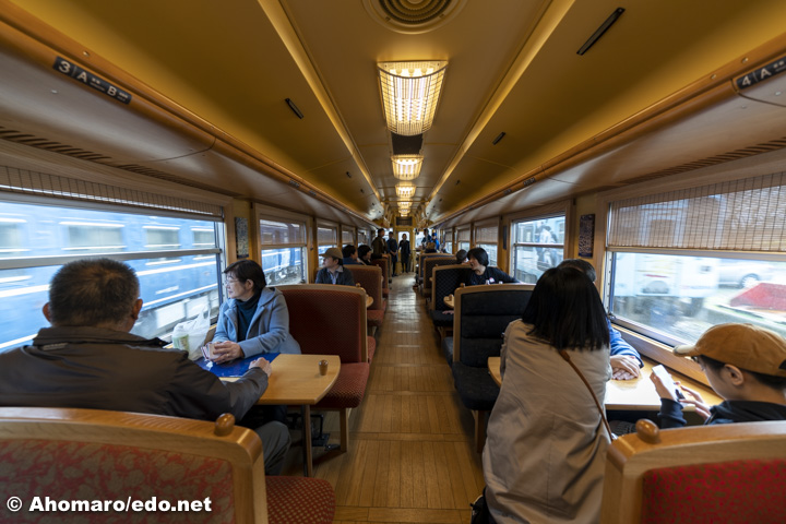 車内は高級感のあるフローリングデッキで、リクライニングシートとカウンター席が用意されておりますが、総て指定席ですよ。