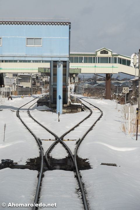 奥羽本線のうち、山形新幹線が走行する福島駅から新庄駅までは、狭軌(軌間1,067mm)から、標準軌(軌間1,435mm)に改軌されているので、普通電車も標準軌専用の車両が使用され、全線で新幹線と同じ交流20,000V、50Hzを使用しているのです。