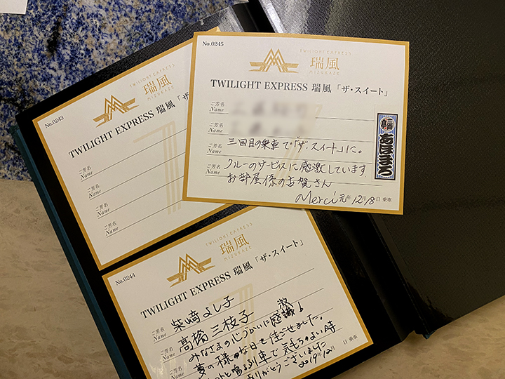 「ザ・スイート」には、歴代の乗客が残したメッセージを収めたアルバムが保管されております。 我々は、245組目の乗客として、記録を残しておきましたので、今度、乗車される方、あほまろの痕跡を探してみてね。