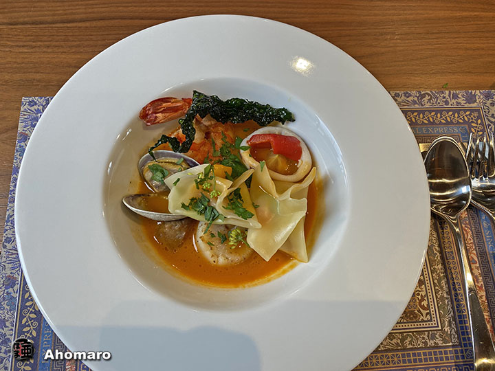 旭川を出ると、すぐに最後のお食事が始まります。思えば、この四日間、毎日三食の豪華食事続きだったので、正直飽きてしまいましたが、最後のお食事はクルーが一押し、美瑛の畑の真中にある隠れ家イラリアンレストラン「バローレ」、シェフが自ら列車に乗り込み、美瑛の新鮮な野菜を爽やかに表現した特別なメニューとのことなので、楽しんでいただきましょうね。